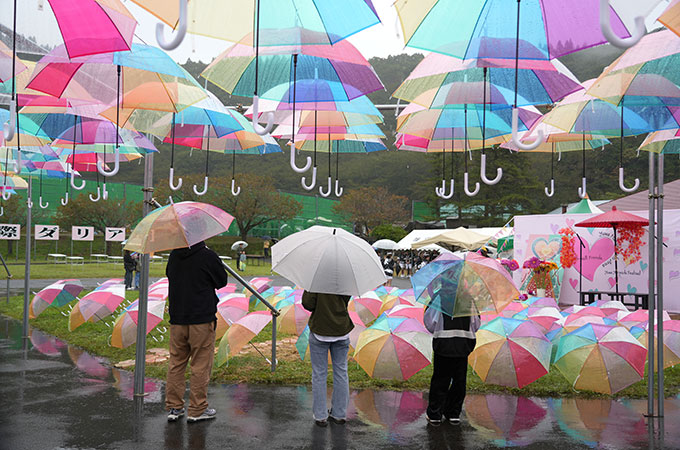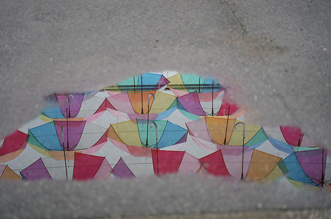 お日さまが隠れているため、アンブレラスタの足元にうつしだされる虹色を皆さまにお見せすることはできませんでしたが、雨量の増加にともないできた水たまりにアンブレラスタが反転され、小さな世界ではありますが足元に映しだされた虹色をお見せすることができました。