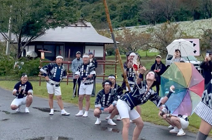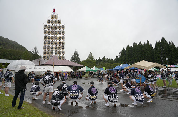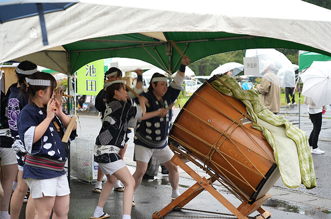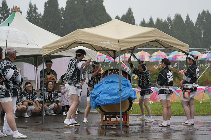 イベント2日目は朝から雨が降り続いているため、午前の部の竿燈演技は予定を変更し、3団体のお囃子の皆さまによるお囃子のみとなりました。